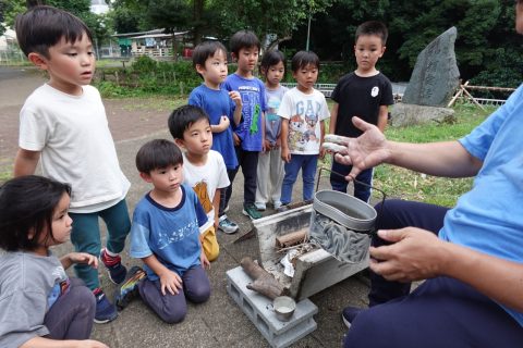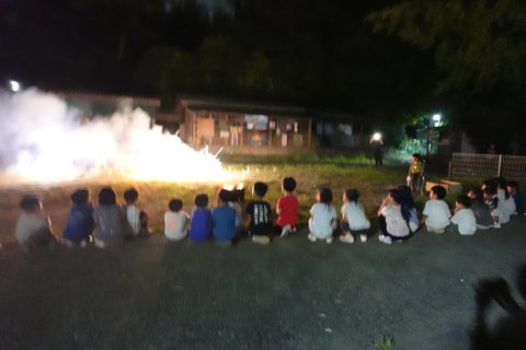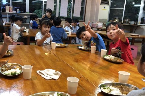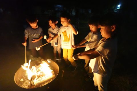 1日目朝は、グループに分かれて近くのスーパーで買い出し。夕飯の支度、飯盒での炊飯に興味津々、みんな大好きなカレーライスでお腹いっぱい。でも、キャンプファイヤーでマシュマロ焼いて、ビスケットで挟んだスモアは別腹の様子。豪華な花火に大興奮して、朝までぐっすりでした(?) お家の人と離れてお泊りするのは初めての子ども達もいましたが、みんなで力を合わせて沢山の素敵な思い出ができました。全員、少したくましくなって、誇らしげに園に戻ってきました!